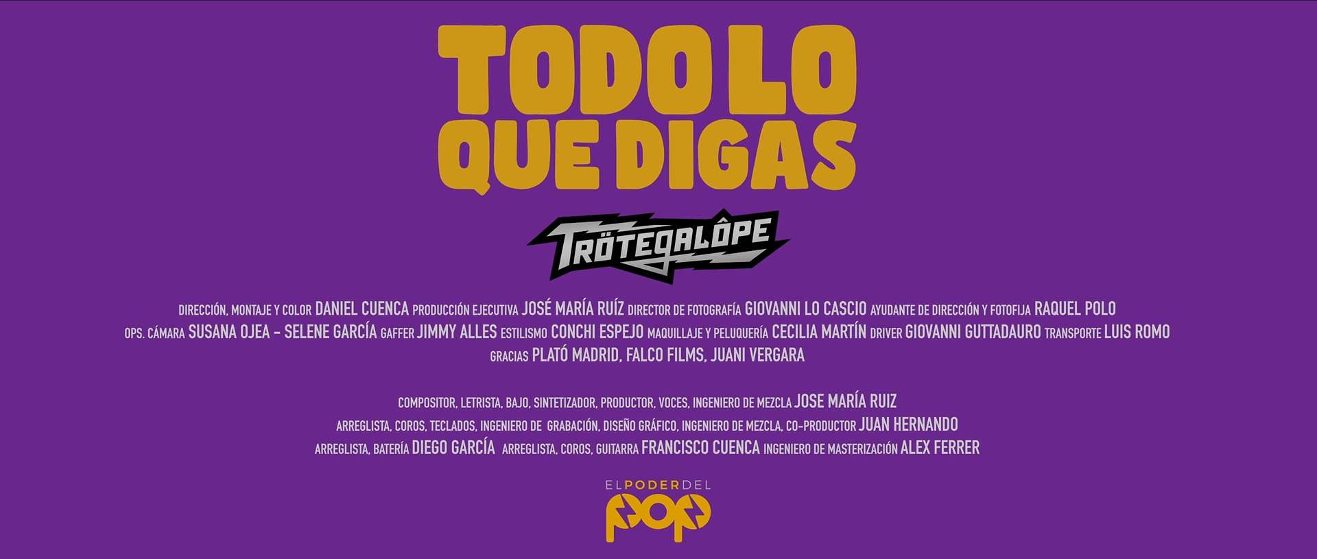 Direction, Editing and Color: Daniel Cuenca https://www.elpoderdelpop.com | Production Manager: Chema Ruiz | First Assistant Director: Raquel Polo | DOP: Giovanni LoCascio | Camera Operator: Susana Ojea, Selene García | Gaffer: Jimmy Vergara | Art Direction y Graphic Design: Juan Hernando| Make-up & Hairdressing: Cecilia Martín | Styling: Conchi Espejo | Unit Stills: Raquel Polo